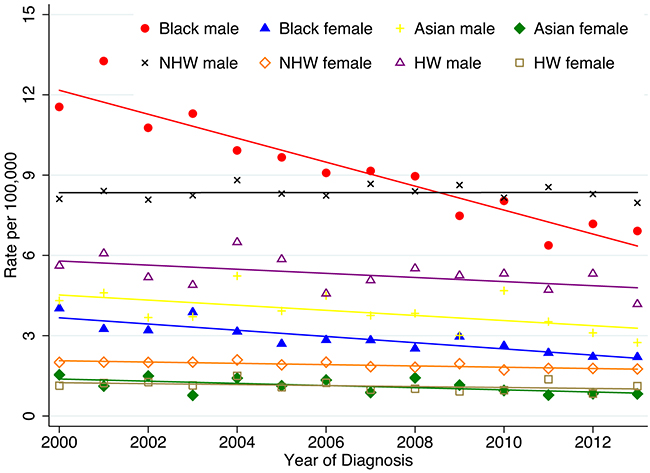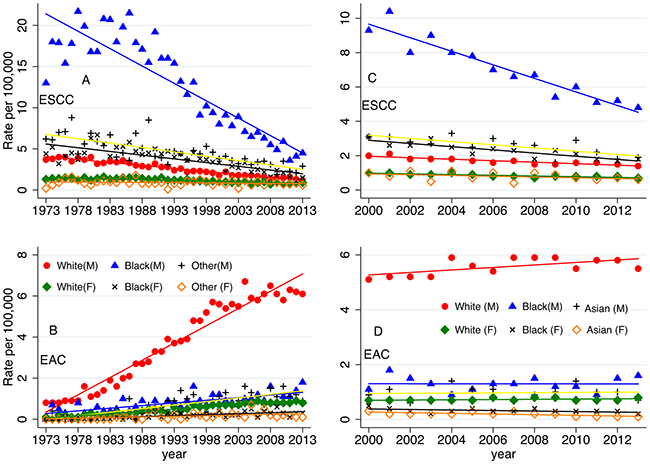 The methods for this study overlap those used in our previous analysis of ethnic differences in lung and bronchial cancer [48]. The data were obtained from all 18 U.S. cancer registries in the Surveillance, Epidemiology, and End Results (SEER) Program database (National Cancer Institute) by using the SEER*Stat software program (version 8.3.2; http://seer.cancer.gov/seerstat [accessed June 28, 2016]) under a data user agreement. Patient records were anonymized and de-identified prior to analyses. Because the data were de-identified and from a third party, no ethics committee review approval was needed. The SEER database was searched to identify patients whose primary tumor sites were coded as C15.0–C15.9 (esophagus) and whose cancers were diagnosed from 1998 to 2013. We included only histological codes for adenocarcinomas (8140–8573) and squamous cell cancers (8050–8082). We excluded 266 patients with race coded as American Indian/Alaska Native because of the small numbers; 156 patients with race coded as unknown were also excluded. From the SEER database, we extracted data on patient demographics, primary tumor site, tumor morphology, cancer stage at diagnosis, first course of treatment, and follow-up vital status. The geographical scope of the SEER database was described previously [49–51]. The SEER*Stat program was used to calculate incidence rates and trends over time. Cancer incidence rates for esophageal cancer were presented for each subtype (EAC&ESCC) by race and sex. Race groups included white, black, others (from 1973 to 2013) and white, black and Asian and Pacific Islander (from 2000-2013). All incidence rates were calculated per 100,000 person-years and were age-adjusted to the 2000 US standard population.