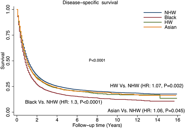 Figure 4: Comparison of disease-specific survival (DSS) rates by different racial/ethnic groups adjusted by stage and tumor histology.