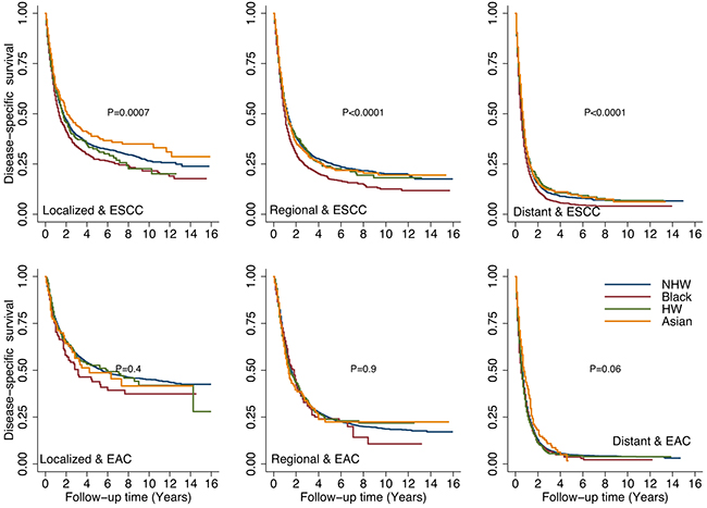 49,766esophageal cancer patients diagnosed from 1998-2013 were included in this study: 77.1% non-Hispanic white (NHW), 11.8% Black, 6.7% Hispanic white (HW), and 4.4% Asian. The median age at diagnosis was 68 years old. The majority of patients had regional (31.0%) or distant (34.2%) disease. 61.7% patients had EAC histology, and 58.6%patients had tumor(s) located in the lower esophagus.