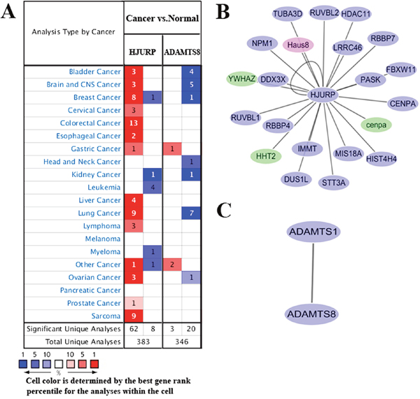 Figure 5: (A) Oncomine analysis of HJURP and ADAMTS8 gene expression in normal and cancer tissues of different types. Gene summary views for HJURP and ADAMTS8 genes were shown, which indicated the number of significant unique microarray results with changes>2.0 fold (P<1E-4 by two tailed t-test). The bottom rows in each case indicate the total number of unique analyses and the number of unique analyses that show significant overexpression (red) or underexpression (blue) of the target gene in the cancer samples relative to the normal tissue samples. Genes coexpressed with HJURP (B) and ADAMTS8 (C) were analyzed using Cytoscape 3.3.0 from different species. Blue node represents gene from Homo species. Red node represents gene from Mus species. Green node represents gene from Bos taurus species.