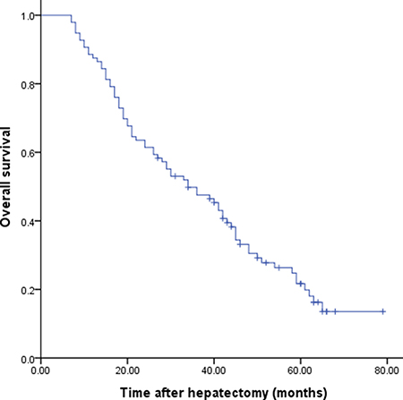 Although solid clinical evidence exists to support surgical resection as the optimal option for the treatment of colorectal liver metastasis (CLM), data evaluating the postoperative outcome of HMGC are limited and controversial (Table 1). This may be explained by the fact that most patients with HMGC presented with multiple lobar metastases, gross peritoneal dissemination, extensive lymph node metastases, distant metastasis, or direct invasion to other organs at time of diagnosis, and therefore were considered unamenable to surgery [5]. It was reported that patients with potentially resectable HMGC treated with systemic chemotherapy had a median survival of 5.5 months, and the number of 3-year survivors was zero [23]. A systematic review of 870 patients from 23 studies performed by Petrelli and colleagues in 2015 demonstrated that resection of HMGC was associated with a 22-month median survival and a 23.8% 5-year OS rate [33]. A similar systematic review was published by Markar et al in 2016, which included 991 patients and come to similar conclusions, with a median 5-year OS of 27% [34]. In accordance with these two reports, the present study also confirmed the benefit of surgical resection for HMGC in achieving long-term survival in a relatively large cohort of patients drawn from multi-centers in China. The 5-year OS rate after surgery was 21.7% with a median survival time of 34.0 months.