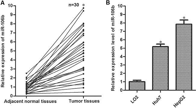 Figure 1: Overexpression of miR-106b in HCC. (A) Tumor tissues and the adjacent normal tissues were obtained from HCC patients. QRT-PCR experiments were performed to analyze the expression of miR-106b in these samples. *P < 0.05 vs. adjacent normal tissues. (B) QRT-PCR experiments were performed to analyze the expression of miR-106b in LO2, Huh7 and HepG2. *P < 0.05 vs. LO2.