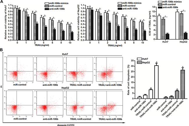 Figure 2: Anti-miR-106b enhances the TRAIL-induced apoptosis in HCC. (A) CCK-8 cell viability assays were performed to evaluate the effect of miR-106b mimics and inhibitors on TRAIL-induced cell death. *P < 0.05. (B) After Huh7 and HepG2 cells were treated with TRAIL (2 ng/ml) and anti-miR-106b, flow cytometry analysis was performed to detect the cell apoptosis. *P < 0.05 vs. miR-control group. #P < 0.05 vs. TRAIL + miR-106b group.