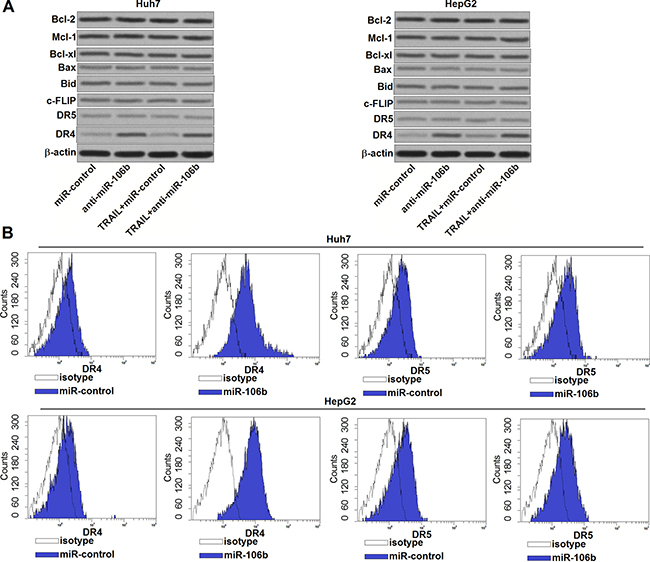 Figure 3: Anti-miR-106b increases the number of DR4 on the surface of HCC cells. (A) After treatment with TRAIL (2 ng/ml) and anti-miR-106b (50 pmol/ml), western blot assays were performed to evaluate the expression of Bcl-2 family proteins and DR4/5 in Huh7 and HepG2. (B) After transfection with anti-miR-106b, flow cytometry analysis was performed to detect the number of DR4/5 on the cell surface of Huh7 and HepG2.