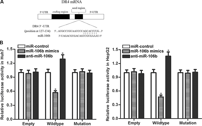 Figure 4: DR4 is the direct target of miR-106b. (A) Complementary pairing site between miR-106b and DR4 3′ UTR showed by TargetScan database. (B) Huh7 and HepG2 cells were co-transfected with miR-106b mimics (or miR-106b inhibitors) and luciferase reporters contained wildtype/mutant 3′-UTR of DR4. 48 h post transfection, luciferase activity was detected using Dual-Luciferase Reporter Assay System according to the manufacturer’s instruction. *P < 0.05 vs. miR-control group.