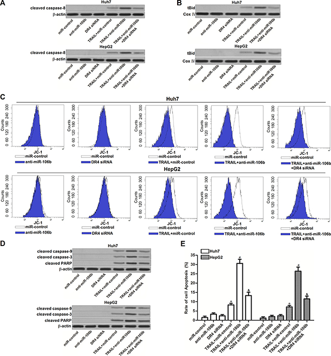 Figure 5: Effect of miR-106b inhibitors on TRAIL-dependent apoptotic pathway. (A) After treatment with TRAIL (2 ng/ml), anti-miR-106b (50 pmol/ml) and DR4 siRNA (50 pmol/ml), western blot analysis was performed to evaluate the effect of anti-miR-106b on TRAIL-dependent activation of caspase-8. (B) After treatment with TRAIL (2 ng/ml), anti-miR-106b (50 pmol/ml) and DR4 siRNA (50 pmol/ml), mitochondria were seperated from Huh7 and HepG2 cells, expression level of tBid was evaluated by western blot analysis. Cox IV was detected as internal control of mitochondrial proteins. (C) After treatment with TRAIL (2 ng/ml), anti-miR-106b (50 pmol/ml) and DR4 siRNA (50 pmol/ml), mitochondrial membrane potential (MMP) of Huh7 and HepG2 cells was detected by flow cytometry by using JC-1 staining. (D) After treatment with TRAIL (2 ng/ml), anti-miR-106b (50 pmol/ml) and DR4 siRNA (50 pmol/ml), cleavage of caspase-9, caspase-3 and PARP in TRAIL signaling pathway was detected by western blot analysis. (E) After treatment with TRAIL (2 ng/ml), anti-miR-106b (50 pmol/ml) and DR4 siRNA (50 pmol/ml), cell apoptosis of Huh7 and HepG2 was measured after they were treated with TRAIL and RNA oligoribonucleotides.