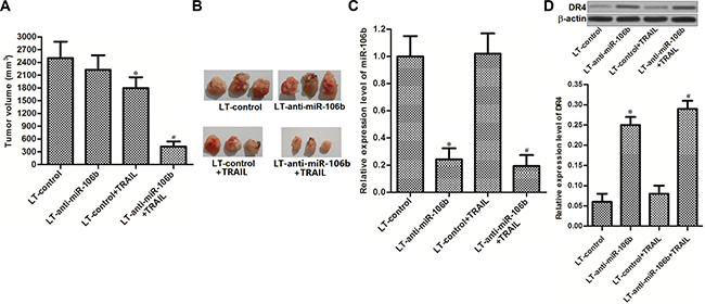 Figure 6: MiR-106b inhibitors sensitize HCC cells to TRAIL in vivo. (A) Tumor volumes of lentivirus transfected HepG2 in vivo model were assessed on day 28 post-injection. (B) Tumor tissues obtained from the HepG2 in vivo model. (C) Expression level of miR-106b in HepG2 tumor tissues was detected by qRT-PCR analysis. *P < 0.05 vs. LT-control group. #P < 0.05 vs. LT-control + TRAIL group. (D) Expression level of DR4 in HepG2 tumor tissues was detected by western blot analysis.*P < 0.05 vs. LT-control group. #P < 0.05 vs. LT-control + TRAIL group.