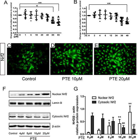 Effect of PTE on cell viability and nuclear translocation of Nrf2 in the primary chondrocytes
