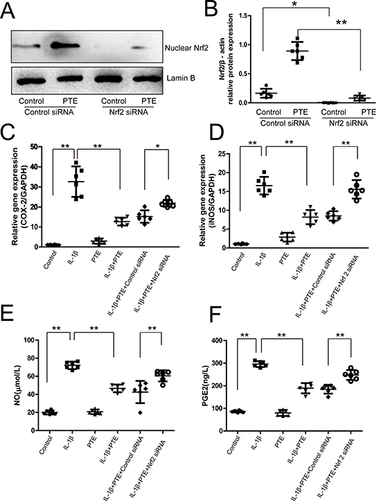 Figure 2: The involvement of Nrf2 in the inhibitory effect of PTE on the expression of inflammatory mediators in the chondrocytes treated with IL-1β. (A) Chondrocytes treated with control siRNA or Nrf2 siRNA were analyzed by Western blotting for the expression of nuclear Nrf2, and the representative images were shown. (B)The optical density for the Nrf2/Lamin B in chondrocytes was analyzed. Data were shown as mean±SD, *P < 0.05, **P < 0.01, n = 6. (C–D) Chondrocytes treated with 10 ng/mL IL-1β alone, IL-1β combined with PTE or IL-1β combined with PTE and Nrf2 siRNA for 24 h were analyzed by real-time PCR for the expression of COX-2 and iNOS. Data were shown as mean ± 95% CI, **P < 0.01, n = 6. (E–F) Chondrocytes treated with IL-1β alone, IL-1β combined with PTE or IL-1β combined with PTE and Nrf2 siRNA for 24 h were analyzed with nitrite measurement and ELISA for NO and PGE2 expression, respectively. Data were shown as mean ± SD, **P < 0.01, n = 6.