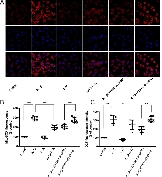 Figure 3: The involvement of Nrf2 in the inhibitory effect of PTE on the ROS production in the chondrocytes treated with IL-1β. (A) Chondrocytes treated with 10 ng/mL IL-1β alone, IL-1β combined with PTE or IL-1β coupled with PTE and Nrf2 siRNA for 24 h were analyzed for the production of mitochondrial superoxide using MitoSOX Red staining. The representative images were shown. (B) The quantitative analysis of MitoSOX Red staining was shown. Data were shown as mean ± 95% CI, **P < 0.01, n = 6. (C) Chondrocytes treated with IL-1β alone, IL-1β combined with PTE or IL-1β combined with PTE and Nrf2 siRNA for 24 h were analyzed for DCF fluorescence intensity. Data were shown as mean ± 95% CI, *P < 0.05, **P < 0.01, n = 6.