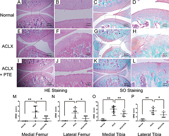The osteoarthritis Sprague-Dawley (SD) rat model was established as previously described [38]. Briefly, 18 male 200–300 g SD (2 months old) rats in the conventional housing were anesthetized by the10% (w/v) chloral hydrate (0.2 mL/100 g) by intraperitoneal injection and randomly divided into 3 groups including normal, anterior cruciate ligament (ACL) transection and partial medial meniscectomy (ACLX), and ACLX+PTE groups. The surgeries were performed on the right knee joints. After exposing the anterior cruciate ligament (ACL) and medial meniscus via the medial approach, the ACL was transected, and the partial meniscus was resected (ACLX). The rats in the ACLX, and ACLX+PTE groups received the above surgery. The rats in the normal group underwent the same incision and exposure without the resection of ACL and meniscus. Subsequent to the surgery, all the animals were administered solvent agent-sunflower oil, and the rats in the ACLX+PTE group received the 30 mg/kg PTE, daily, p.o. in sunflower oil for 8 weeks. 8 weeks after the surgery, 6 rats in every group were euthanized for the histological analysis and immunohistochemistry.