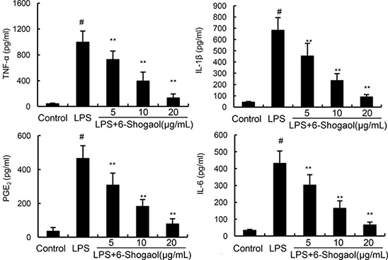 To investigate the anti-inflammatory effects of 6-Shogaol, the expression of inflammatory mediators were detected in this study by ELISA. As shown in Figure 2, LPS dramatically increased the production of TNF-α, IL-1ß, IL-6, and PGE2. However, 6-Shogaol concentration dependently down-regulated the production of TNF-α, IL-1ß, IL-6, and PGE2 induced by LPS.