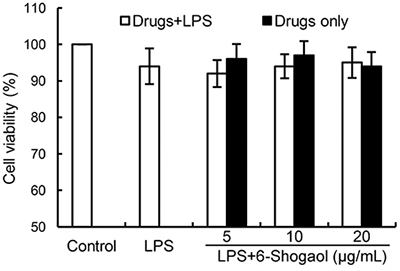 Figure 1: Effects of 6-Shogaol on the cell viability of BV2 microglial cells. Cells were cultured with different concentrations of 6-Shogaol (5, 10, 20 μg/ml) in the absence or presence of 0.5 μg/mL LPS for 24 h. The cell viability was determined by MTT assay. The values presented are the means ± SEM of three independent experiments.