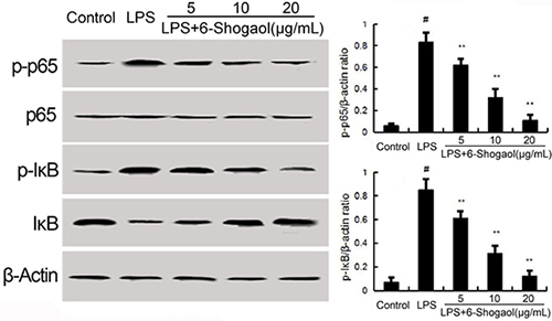 Figure 3: Effects of 6-Shogaol on NF-κB expression. The values presented are the means ± SEM of three independent experiments. #p < 0.05 vs. control group; *p < 0.05, **p < 0.01 vs. LPS group.
