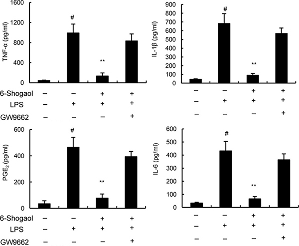 Figure 5: Effects of PPAR-γ inhibitor GW9662 on the anti-inflammatory effects of 6-Shogaol. Cells were treated with GW9662 for 12 h. Then, the cells were treated with 6-Shogaol and stimulated by LPS. The productions of inflammatory mediator were detected 24 h after LPS treatment. The values presented are the means ± SEM of three independent experiments. #p < 0.05 vs. control group; *p < 0.05, **p < 0.01 vs. LPS group.