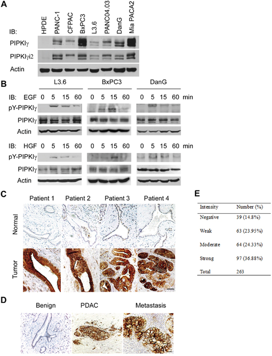 Figure 1: PIPKIγ is upregulated in human pancreatic ductal carcinoma. (A) PIPKIγ expression is increased in cultured PDAC cells. Indicated normal human pancreatic ductal epithelial cells (HPDE) and different types of malignant PDAC cells were collected to make cell lysates for immunoblotting analyses with anti-PIPKIγ antibody. (B) PIPKIγ is phosphorylated at Y639 responding to EGF or HGF stimulation. Three different types of PDAC cells were serum starved overnight and treated with 10 ng/mL EGF or HGF for indicated time. Then cell lysates were prepared for immunoblotting with antibodies against total (pan-PIPKIγ) or Y639-phosphorylated (pY-PIPKIγ) PIPKIγ. (C and D) Phosphorylation level of PIPKIγ is dramatically increased in PDAC lesions. (C) pY-PIPKIγ antibody was used to stain human PDAC tissues (lower panels, tumor) and matched adjacent non-tumor tissues (upper panels, normal). Staining results from 263 patients were summarized in right panel. (D) Metastatic PDAC lesions also exhibit high level of pY639-phosphorylated PIPKIγ. Representative images of immunohistochemistry staining using pY-PIPKIγ antibody in benign, PDAC and lymphoid node metastases from the same patient were shown. Scale bar, 50μm.