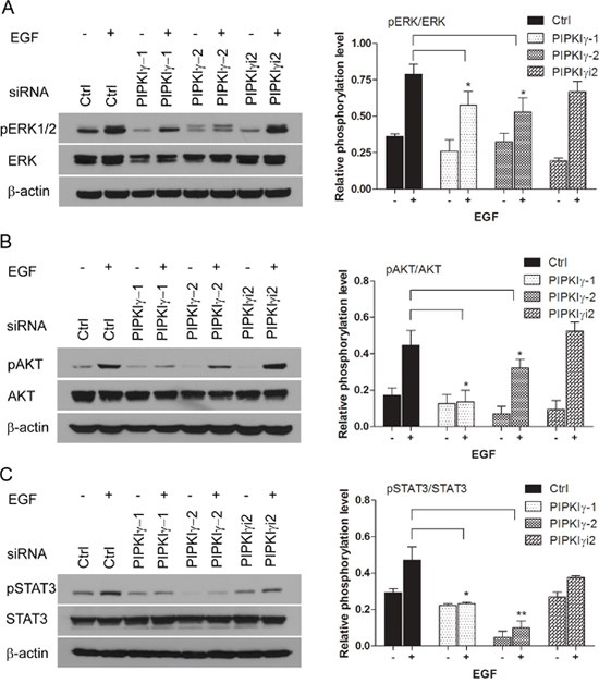 Figure 2: PIPKIγ is required for EGF-induced activation of MAPK, PI3K/AKT and STAT3 pathways. The expression of PIPKIγ was silenced using three different siRNA sequences in DanG cells for 48 hours. With or without 15 minutes EGF (10 ng/mL) stimulation after overnight serum starvation, cells were subjected to immunoblotting using indicated antibodies to examine the activation of ERK1/2 (A), AKT (B), or STAT3 (C). pERK1/2, phosphorylated ERK1/2; ERK, total ERK1/2; pAKT, phosphorylated AKT; AKT, total AKT; p-STAT3, phosphorylated STAT3; STAT3, total STAT3. ImageJ was used to measure the intensity of each band. Intensities of phosphorylated ERK1/2, AKT or STAT3 bands were normalized against ERK1/2, AKT, or STAT3, respectively to represent the relative activation level of these kinases. Results from three independent experiments were statistically analyzed and plotted as panels shown at the right. *, p<0.05; **, p<0.01.