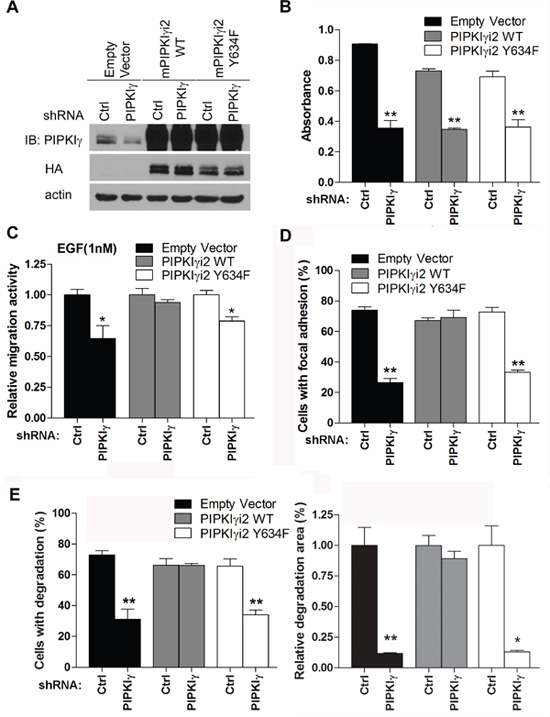 Figure 7: Y639 phosphorylation in PIPKIγ is required for focal adhesion assembly, cell migration, and matrix degradation in PDAC cells. HA-tagged wild type (WT) or Y634F mouse PIPKIγi2 (mPIPKIγi2) was stably expressed in L3.6 or DanG cells by lentivirus-mediated transduction. Then cells were transfected with lentivirus carrying control or hPIPKIγ-specific shRNA to knock down the endogenous hPIPKIγ. (A) The expression of HA-tagged wild type (PIPKIγi2 WT) or Y634F (PIPKIγi2 Y634F) mPIPKIγi2 and the depletion of endogenous hPIPKIγ in L3.6 cells were confirmed by immunoblotting using indicated antibodies. (B) The proliferation of indicated L3.6 cell lines was determined using MTT assay. mPIPKIγi2 did not restore the in vitro proliferation defect caused by depletion of endogenous hPIPKIγ isoforms. (C-E) Expression of wild type mPIPKIγi2, but not its Y634 mutated couterpart, rescued the defective cell migration (C), focal adhesion assembly (D), and matrix degradation (E) in hPIPKIγ-depleted cells. (C) Cells from indicated L3.6 lines were subjected to Boyden Chamber migration assay with 1 nM EGF as attractant. (D) L3.6 cells from indicated lines were plated on collagen-coated glass coverslip for 1 hour in complete medium. Cells were then fixed and subjected to indirect immunofluorescence staining with antibodies against phosphotyrosine (green) and talin (red). DAPI (blue) was used to visualize the nucleus. The percentage of cells (n=100 cells/group) with mature focal adhesions was quantified under fluorescence microscope. (E) DanG cells expressing indicated shRNA and cDNA were plated on fluorescent gelatin-coated coverslips and subjected to matrix degradation assay. Left panel, quantification of cells associated with matrix degradation. Right panel, quantification of degradation area normalized against cell number. Results from three independent experiments were statistically analyzed and plotted. *, p<0.05. **, p<0.01.