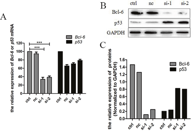 Figure 2: Bcl-6 mediated the upregulation of p53 in K562/G01 cells. (A) K562/G01 cells treated with Bcl-6 siRNA1 and siRNA2 for 48h. The levels of Bcl-6 mRNA were (30.67±0.82)% and (38.74 ±1.76)% respectively, compared with control. The p53 mRNA was slightly downregulated. (B) K562/G01 cells treated with Bcl-6 siRNA1 and siRNA2 for 48h. The Bcl-6 protein reduced obviously. And si-1 and si-2 show that p53 protein was upregulated distinctly. (C) The relative expression of Bcl-6 and p53 proteins. The expression of mRNA was determined by qPCR. The expression of proteins were determined by western blot. Values shown are mean ± SD. Of three independent experiments.