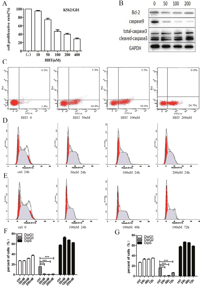 Figure 4: Cell growth inhibition, apoptosis and cell cycle arrest of HHT in K562/G01 cells. (A) K562/G01 cells were treated with HHT at the indicated concentrations for 24 hours. The concentrations were 0, 10, 50, 100, 200, 400 nM. (B) The expression of apoptosis proteins. K562/G01 cells treated with HHT 0, 50nM, 100 nM, 200nM for 24h. Bcl-2, caspase9, caspase3 express. (C) Apoptosis of K562/G01 cells. K562/G01 cells treated with HHT 0, 50nM, 100 nM, 200nM for 24h. (D) Cycle of K562/G01 cells. K562/G01 cells treated with HHT 0, 50nM, 100 nM, 200nM for 24h. (E) Cycle of K562/G01 cells. K562/G01 cells treated with 100 nM HHT for 24h, 48h, 72h. (F) Cycle of K562/G01 cells. K562/G01 cells treated with HHT 0, 50nM, 100 nM, 200nM for 24h. (G) Cycle of K562/G01 cells. K562/G01 cells treated with 100 nM HHT for 24h, 48h, 72h. Cell viability was determined by CCK-8. The expression of proteins were determined by western blot. PE annexin V detect apoptosis. Flow cytometry detect cycle. Values shown are mean ± SD. Of three independent experiments.