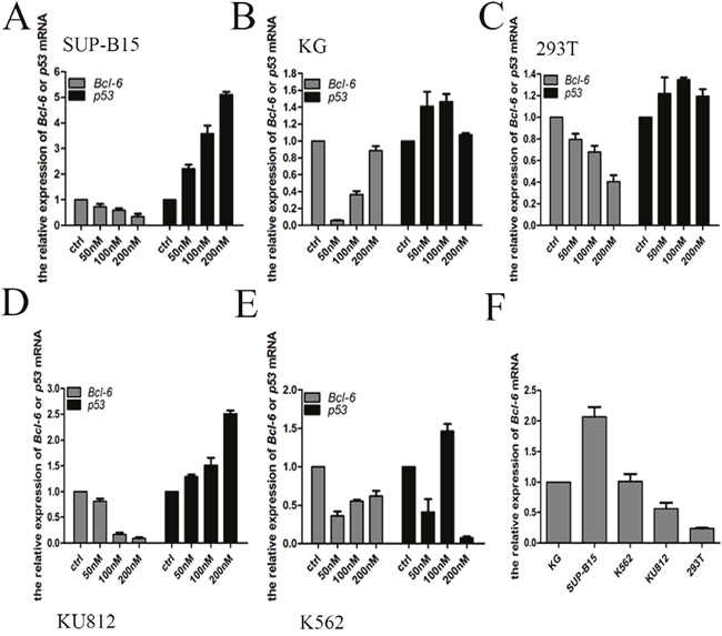 Figure 7: HHT effect the Bcl-6 and p53 mRNA expression. (A) SUP-B15 cells were treated with HHT 0, 50nM, 100 nM, 200nM for 24h. (B) K562/G01 cells were treated with HHT 0, 50nM, 100 nM, 200nM for 24h. (C) 293T cells were treated with HHT 0, 50nM, 100 nM, 200nM for 24h. (D) KU812 cells were treated with HHT 0, 50nM, 100 nM, 200nM for 24h. (E) K562 cells were treated with HHT 0, 50nM, 100 nM, 200nM for 24h. (F) The Bcl-6 expression of 5 cells without treatment. The expression of mRNA were determined by qRT-PCR. Values shown are mean ± SD. Of three independent experiments.