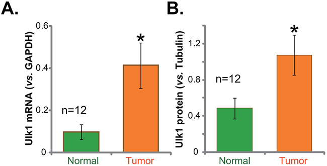 Figure 1: Ulk1 over-expression in fresh human gastric cancer tissues. The fresh human gastric cancer tissues (“Tumor”, n=12) and the surrounding normal gastric epithelial tissues (“Normal”, n=12) were lysed; Expressions of Ulk1 mRNA (A) qRT-PCR assay and Ulk1 protein (Western blotting assay) were tested. Ulk1 protein expression was quantified (B) vs. loading Tubulin, n=12. *p<0.05 vs. “Normal”.