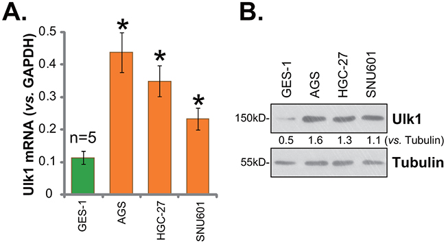Figure 2: Ulk1 over-expression in human gastric cancer cells. Human gastric cancer cell lines (AGS, HGC-27, and SNU601) and the GES-1 gastric mucosal epithelial cells were subjected to qRT-PCR assay (A) and Western blotting assay (B) to test Ulk1 expression. * p<0.05 vs. GES-1 cells. Experiments in this figure were repeated three times, and similar results were obtained.