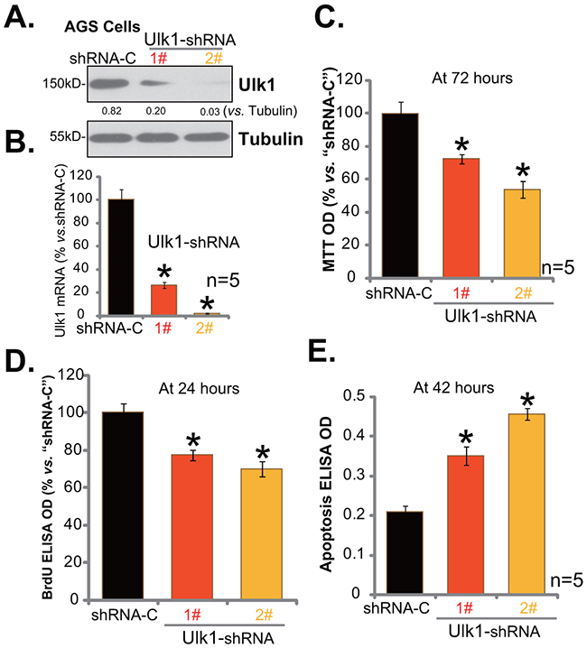 Figure 3: Ulk1 shRNA knockdown inhibits gastric cancer cell survival. Expressions of Ulk1 protein (A) and Ulk1 mRNA (B) in AGS cells with lentiviral Ulk1 shRNA (“1#” or “2#”) or scramble control shRNA (“shRNA-C”) were shown. Above cells were also subjected to MTT assay (C), BrdU ELISA assay (D) and Histone DNA ELISA assay (E) to test cell survival, proliferation and apoptosis, respectively. For these assays, exact same number of viable cells with listed shRNA was plated initially (At 0 hour). *p<0.05 vs. “shRNA-C” cells. Experiments in this figure were repeated four times, and similar results were obtained.