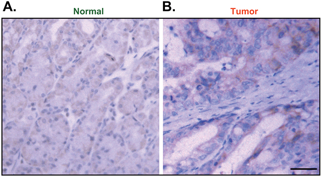 Figure 5: Immunohistochemistry (IHC) staining of Ulk1 in paraffin-embedded tissues. Representative Ulk1 IHC images in paraffin-embedded gastric cancer tissues (“Tumor”, B) and surrounding normal epithelial tissues (“Normal”, A) (Bar=100 μm).