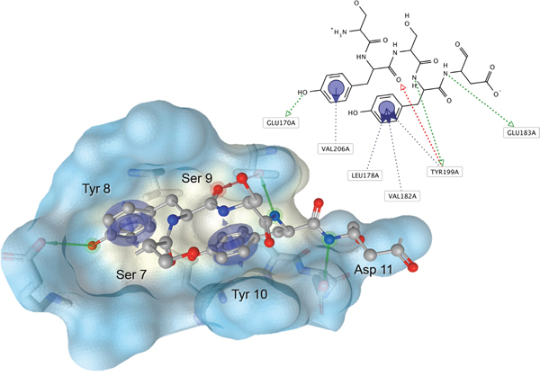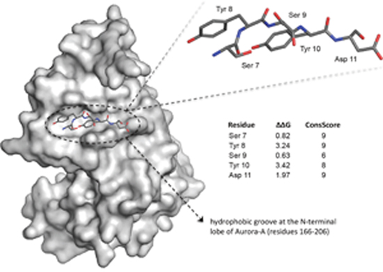 Figure 1: Analysis of the Aurora-A/TPX2 interaction interface and hot spots identification. Residues 7-11 of human TPX2 (sticks) bind at a shallow hydrophobic groove at the N-terminal lobe of Aurora-A (grey surface). Evolutionary conservation (ConsScore) and ΔΔG upon computational Alanine mutagenesis are reported. Among these residues, Tyr 8 (ΔΔG = 3.24 Kj/Mol) and Tyr 10 (ΔΔG = 3.42 Kj/Mol) were predicted as key residues for the thermodynamic stabilization of the complex.