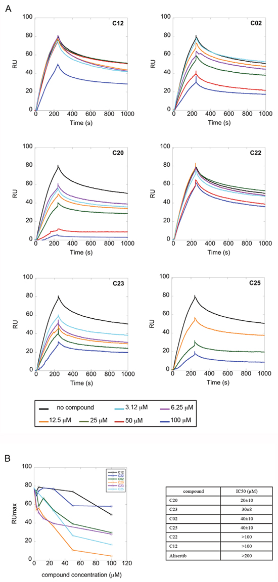 Figure 4: Competition experiments between GST-TPX2-1-43 and selected compounds for Aurora-A binding. (A) Sensorgrams of competition experiments carried out on COOH5 chips with Aurora-A immobilized at a level of about 200 RUs, by injecting 1 μM GST-TPX2-1-43 together with increasing concentrations of compounds. (B) Fitting of competition experiments data. The decrease of TPX2 binding upon injection of increasing concentrations of competing compounds is shown. IC50 values of tested compounds are shown in the table on the right; standard errors of best-fit parameters are indicated.