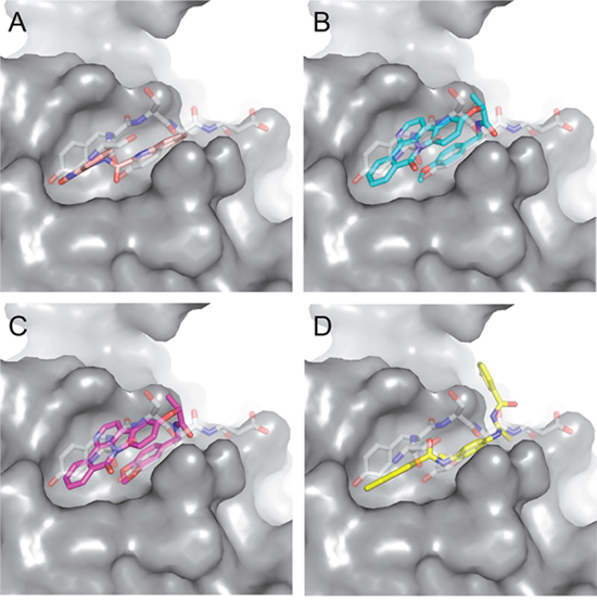 Figure 5: Predicted binding mode of compounds to Aurora-A. The hydrophobic groove at the N-terminal lobe of Aurora-A is shown as grey surface. The position of TPX2-7-11 is shown in transparent sticks. Atom coloring is the following: N blue, O red, S orange. C02 (A), C23 (B), C25 (C) and C20 (D).