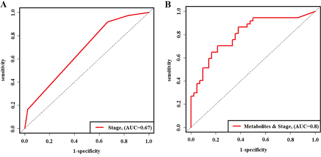 Figure 4: Time-dependent ROC curves evaluating predictive accuracy of three-year survival. (A) time-dependent ROC curve for pathological stage in the predictive of three-year survival of EOC patients. (B) time-dependent ROC curve for risk scores combined the predictive metabolites and pathological stage in the prediction of three-year survival of EOC patients.