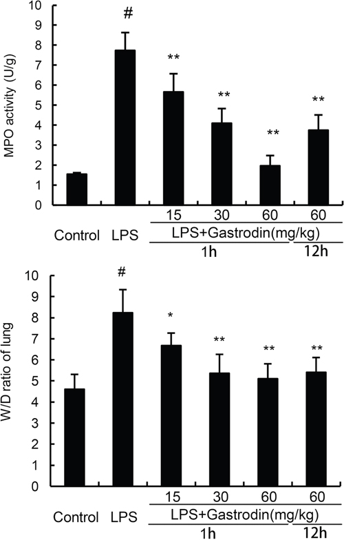 Figure 2: Effects of gastrodin on MPO activity in lung tissues and lung wet to dry weight ratio of LPS-induced ALI. The values presented are the mean ± SEM (n=12 in each group) of three independent experiments. p#<0.01 vs. control group, p**<0.01 vs. LPS group.