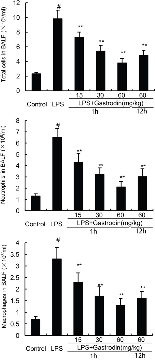 Figure 4: Effects of gastrodin on inflammatory cell count in the BALF of LPS-induced ALI mice. The values presented are mean ± SEM (n=12 in each group) of three independent experiments. p#<0.01 vs. control group, p*<0.05, p**<0.01 vs. LPS group.
