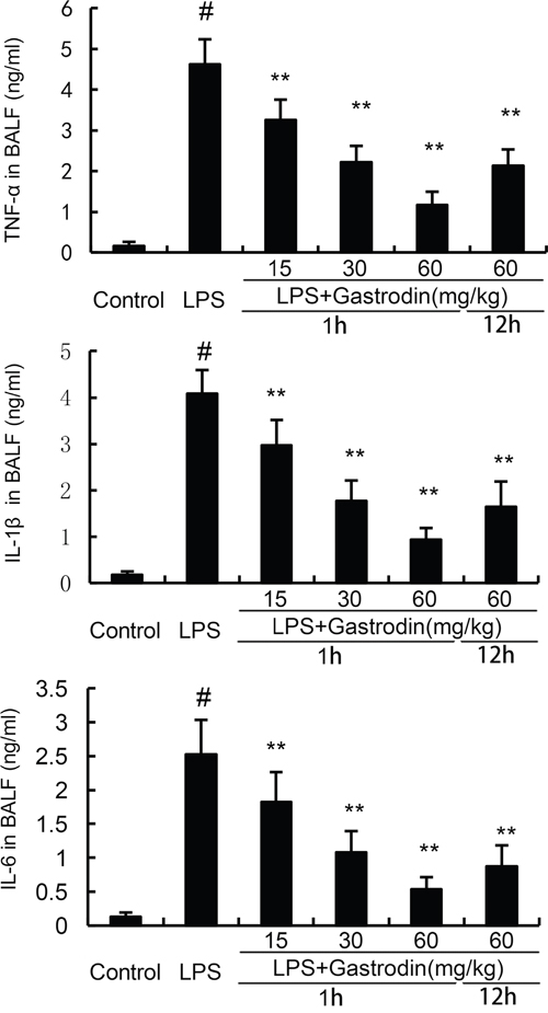 Figure 5: Effects of gastrodin on TNF-α, IL-1ß, and IL-6 production in the BALF of LPS-induced ALI mice. The values presented are mean ± SEM (n=12 in each group) of three independent experiments. p#<0.01 vs. control group, p**<0.01 vs. LPS group.