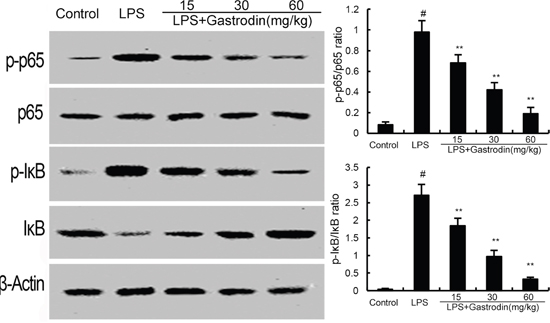 To investigate the anti-inflammatory mechanism of gastrodin, western blot analysis was applied to investigate the effects of gastrodin on LPS-induced NF-κB activation in lung tissues. The results showed thatLPS obviously increased the phosphorylation of NF-κBp65 and I-κBα. However, gastrodin treatment significantly inhibited the phosphorylation of NF-κBp65 and I-κBα (Figure 6).