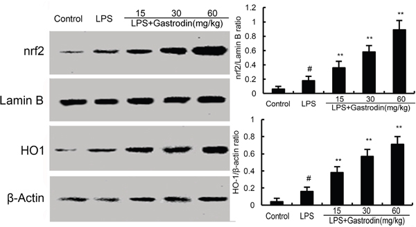 The effects of gastrodin on Nrf2 signaling pathway were measured by western blot analysis. As shown in Figure 5, compared with the control group, the expression of Nrf2 and HO-1 increased in LPS-treated group. However, gastrodin dose-dependently increased the expression of Nrf2 and HO-1 (Figure 7).