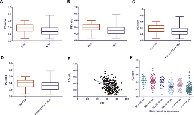 Figure 1: PZ-ratio in PCa and biopsy-negative patients in all PCa of all patient group (A) and of patients with PSA of 4–10 ng/ml (B)significant PCa vs. insignificant PCa+ negative biopsy of all patient group (C) and patients with PSA of 4–10 ng/ml (D) and the relevance of PZ-ratio with age in all ages (E) and subdivided by age groups (F). PZ-ratio, peripheral zone volume ratio; PCa, prostate cancer; NBx, negative biopsy; Sig PCa, significant prostate cancer; nonsig PCa, non-significant prostate cancer.