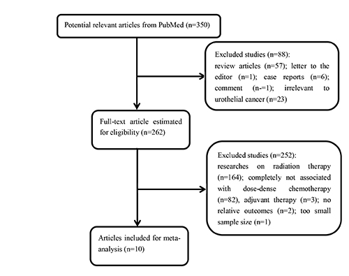 The inclusion criteria for the current analysis were that studies (i) included patients diagnosed with urothelial cancer; (ii) evaluated dose-dense chemotherapy; (iii) reported survival outcomes of patients (pCR or OS or PFS or ORR); and (iiii) evaluated the toxicities.