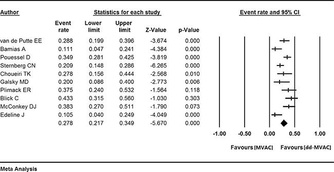 The improved overall survival represented the advantage of long-term survival in dd-MVAC group, which was presumed to arise from the elimination of micrometastatic disease, instead of from improved local disease control [13]. In addition, better median progression-free survival was suggested by one study [16] with dd-MVAC (9.5 months) vs. classic MVAC (8.1 months) (HR = 0.73, 95% CI 0.56–0.95, P = 0.017).