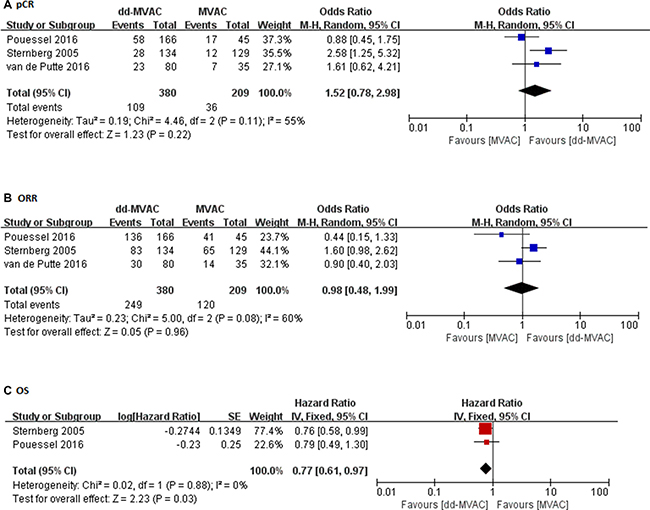 Figure 3: (A) The odds ratios of pathologic complete response (pCR) in the controlled trials comparing dd-MVAC and classic MVAC; (B) The odds ratios of objective response rate (ORR) in the controlled trials comparing dd-MVAC and classic MVAC; (C) Forest plots of the pooled hazard ratios (HRs) for OS.