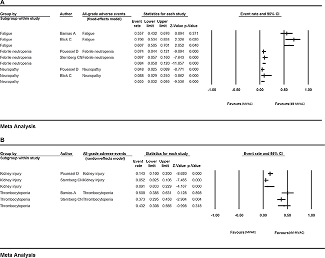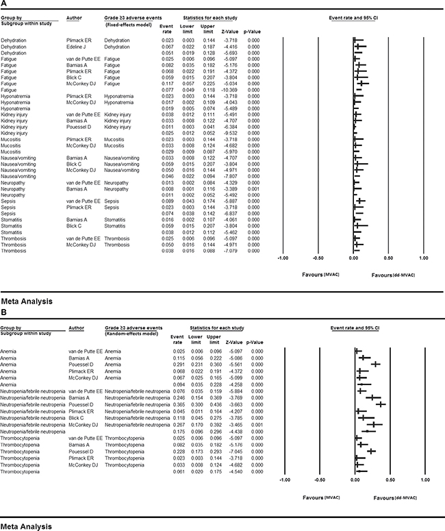 Figure 5: Grade 3 or more AEs in the ten included studies (A) fixed-effects model; (B) random-effects model..