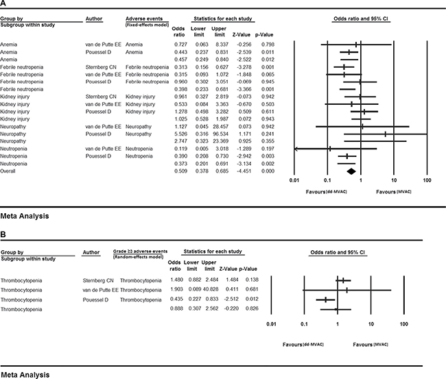 Figure 6: The odds ratios of adverse events (AEs) in the controlled trials comparing dd-MVAC and classic MVAC. (A) fixed-effects model; (B) random-effects model.