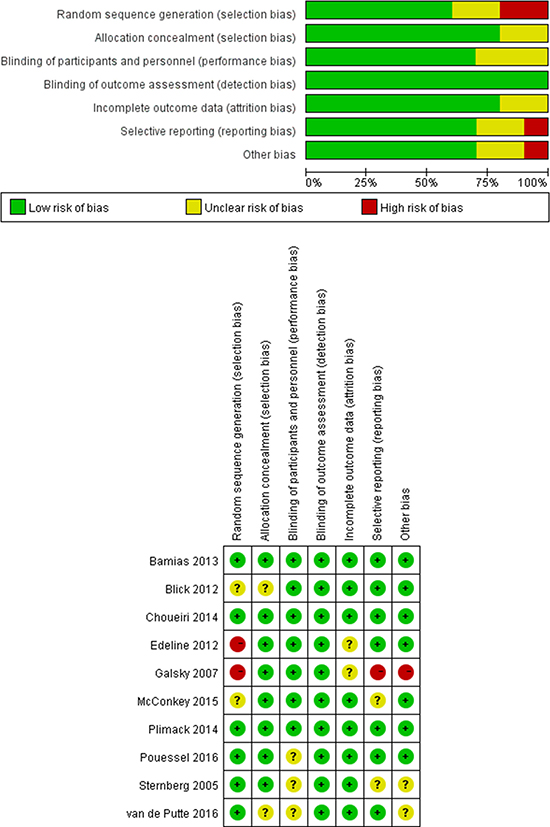 The initial search yielded 849 unique articles after deletion of duplicates. After title and abstract screening, 555 were excluded as they were case reports, letters, review articles, or irrelevant to urothelial cancer, leaving 294 articles for full review. After assessing the full texts of these potentially relevant studies, 284 were excluded for the following reasons: 189 were researches on radiation therapy, 85 were completely not associated with dose-dense chemotherapy, 5 were about adjuvant therapy, 4 contained no relative outcomes, and 1 was with a too small sample size. Ultimately, 10 eligible articles [7, 9–17] involving a total of 1093 patients were included for analyses. No additional unpublished trials were added to the literature search results. A flow diagram of the trial selection process is shown in Figure 1.