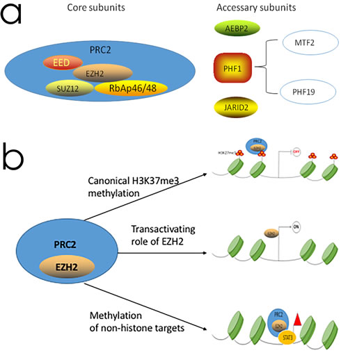 Figure 1: The PRC2 complex structure and the function of EZH2 in transcriptional regulation. a. The PRC2 complex consist of four core subunits, namely, EZH2, EED, SUZ12 and RbAp46/48 and additional proteins like AEBP2, PHF1, and JARID2. b. The functional role of EZH2: as a subunit of PRC2, EZH2 methylates H3K27 which contributing transcriptional silencing, EZH2 also have a PRC2 independent role in transcriptional activation and can methylate a number of non-histone protein substrates. OFF and ON refer to transcriptional silencing and activation, respectively.