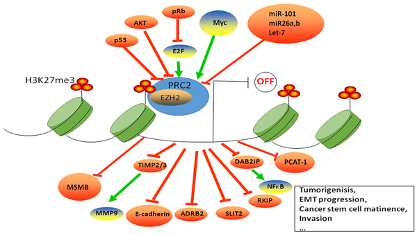 As a histone trimethyltransferase, EZH2 represses transcription of a number of tumorigenesis and metastasis suppressor genes thereby regulating prostate cancer development. A list of direct targets of EZH2 is shown in Table 1, which indicates that EZH2 is a bonafide oncogene. Enhanced EZH2 expression suppresses DABI2P expression that is part of the Ras-NFkB signaling pathway resulting in initiation and metastasis of prostatic tumors [75, 76] . Moreover, EZH2 represses the expression of adrenergic receptor beta 2 (ADRB2), which is a critical mediator of β-adrenergic signaling that ultimately leads to cell transformation and invasion [77]. E-cadherin is another EZH2 target that mediates epithelial to mesenchymal transition [50]. Also, PSP94, SLIT2 and CDKN2A are downstream targets of EZH2 in prostate cancer that mediates tumorigenesis and metastasis. PSP94 is a suppressor of tumor growth and metastasis; SLIT2 inhibits prostate cancer cell proliferation and invasion; and CDKN2A is a critical tumor suppressor gene [78-80]. Moreover, a direct relationship between EZH2 and TIMP2/3-tissue inhibitors of metalloproteinase-results in enhanced proteolytic activity of MMP-9 in prostate cancer cells [81]. The lncRNA, DANCER represses TIMP2/3 expression by mediating the binding of EZH2 on their promoters thereby promoting prostate cancer invasiveness [82]. High expression of the EZH2 gene is also associated with low MSMB levels in metastasizing prostate cancer [83]. Meanwhile, EZH2 can repress long non-coding RNA, PCAT-1, which is a prostate specific regulator of cell proliferation [84]. In addition, Raf-1 kinase inhibitor protein (RKIP), a tumor and metastasis suppressor is repressed by EZH2. Lack of RKIP disrupts major cellular signaling pathways like Raf-1/MEK/ERK, NFkβ, and GPCR resulting in prostate cancer development and metastasis [85]. Furthermore, RNNX1, a direct target of AR is repressed by H2K27me3 and is negatively regulated by EZH2 [86]. Notably, miR-26a and miR-138a block the G1/S-phase transition in prostate cancer, independent of EZH2, via a concerted inhibition of crucial cell cycle regulators [87].