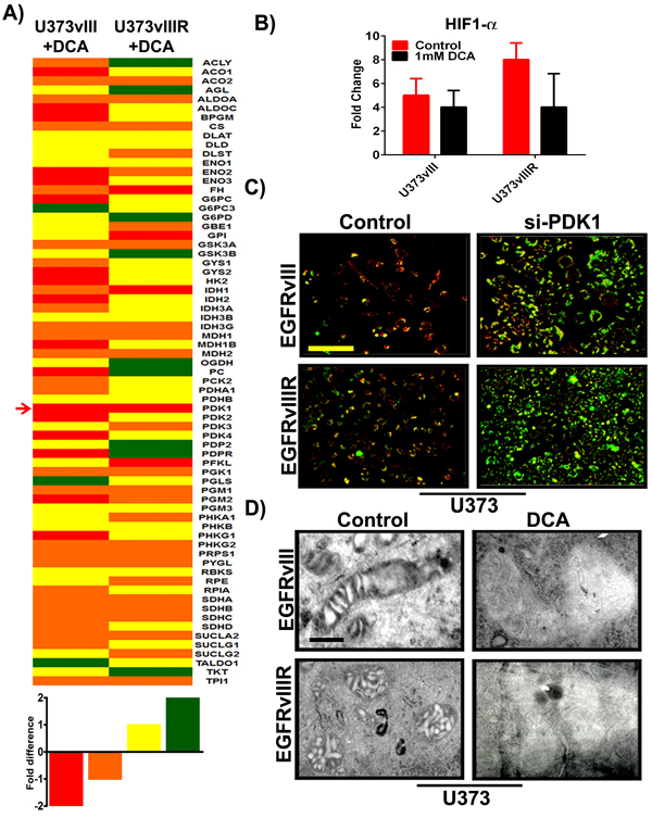 To gather a broad understanding of the effects of EGFRvIII overexpression and its TMZ resistance (EGFRvIIIR) on altered metabolism in glioblastoma, we used the human glucose metabolism RT2 profiler™ PCR array (cat # PAHS-006Z, SABiosciences, Valencia, CA) to study the expression of 84 key genes involved in the regulation and enzymatic pathways of glucose metabolism. Changes in glucose metabolic gene expression are a common feature of glioblastoma and specifically tumors show decreased oxidative phosphorylation, and reduced transcription of TCA cycle genes even in the presence of sufficient oxygen. Pharmacological inhibition of EGFR and PDK with DCA was reported recently to inhibit xenograft tumor growth in a variety of carcinoma and glioblastoma cancer cell lines [20, 21]. In the present study RNA from both the U373vIII and U373vIIIR along with their respective treatments using 1mM DCA were isolated and used for PCR microarray expression profiling. RNA expression profiles of U373vIII+DCA and U373vIIIR+DCA are depicted in heat-map format (Figure 4A). The genes listed were sorted based on overall expression levels in both conditions. In order to quickly scan if specific genes were differentially expressed in the U373vIIIR cells compared to the U373vIII cells, we used the simple ad hoc method fold change to calculate the EGFRvIII/ EGFRvIIIR expression ratio after DCA treatment. Genes with an expression ratio above -1.4 were considered highly downregulated, above -1.0 moderately downregulated and genes with an expression ratio of above 1.0 moderately upregulated, above 1.4 were considered highly upregulated. PDK1 was the sole gene highly downregulated in both cells tested suggesting that targeting PDK1 and EGFR in mechanisms that bypass TMZ resistance may be a key factor in reverting the Warburg aerobic glycolysis metabolic pattern in glioblastoma. Our previous results have shown that HIF1α regulates the PDK1/ EGFR interaction in the mitochondria and transcriptionally regulates PDK1 in glioblastoma [22, 23]. To further determine to what extent HIF1α regulates EGFRvIII/EGFRvIIIR and its interaction with PDK1 cells upon DCA treatment, we interrogated the expression of HIF1α. We validated our findings by qPCR and found that the genes encoding HIF1α were reproducibly lower in DCA-treated cells, when compared with that of their respective controls (Figure 4B). Taken together, our preliminary data show that DCA treatment in EGFRvIII/EGFRvIIIR GBM cells resulted in the coordinated downregulation of the expression of genes encoding members of glucose metabolism. We next investigated whether the induction of apoptosis in U373vIII/U373vIIIR cells by si-PDK1 involved alterations of mitochondrial membrane potential (ΔΨm), we examined its effect on ΔΨm in the aforementioned cells. Since induction of mitochondrial apoptosis mostly results in the loss of ΔΨm and measurement of ΔΨm is a sensitive measure for mitochondrial function in vitro, we examined the effect of si-PDK1 by JC-1 staining. U373vIII and U373vIIIR cells along with their aforementioned treatment were assessed at 24h post-treatment using the JC-1 dye. Fluorescence microscopy shows that control cells (untreated) had strong J-aggregation (red) and weak JC-1 monomer. In siPDK1-treatment, many cells showed strong JC-1 monomer (green staining) with concomitantly decreased J-aggregation (red staining) due to low ΔΨm (Figure 4C), thus indicating DCA induced ΔΨm change in GBM cells during apoptosis. To establish whether DCA induced cell death in GBM cells has the ultra-structural characteristics of apoptosis, mitochondria from U373vIII, U373vIIIR controls along with their DCA treated cells were compared using transmission electron microscopy (TEM). Mitochondria obtained from control cells showed vesicular and swollen structures indicative as a result of EGFRvIII overexpression as described previously [24]. Significant swelling and loss of mitochondrial membrane was observed in DCA treated cells, providing evidence that mitochondrial swelling may also be indicative of the apoptosis in GBM cells (Figure 4D).