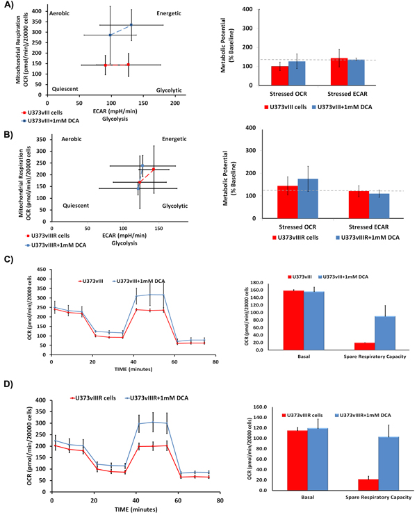 Both U373vIII/U373vIIIR cells were plated at a density of 30,000/well in an XFp eight well plate. Cells were allowed to grow overnight in 1mM DCA and the media were exchanged 1 hour before the assay with XFp media to determine the oxygen consumption rate (OCR) and extracellular acidification rate (ECAR). For cell energy phenotype assay, FCCP and oligomycin were diluted into XFp media and loaded into the accompanying cartridge to achieve final concentrations of 10µM; for mitostress assay, oligomycin, FCCP and rotenone/antimycin A were diluted to achieve final concentrations of 1.0µM and 0.5µM respectively. Injections of the drugs into the medium occurred at the time points specified. These experiments were done to define a basal OCR, ATP-linked OCR, proton leak, maximal respiratory capacity, reserve respiratory capacity, and non-mitochondrial oxygen consumption. All reagents were purchased from Seahorse Biosciences. Results were representative of at least 3 independent experiments.