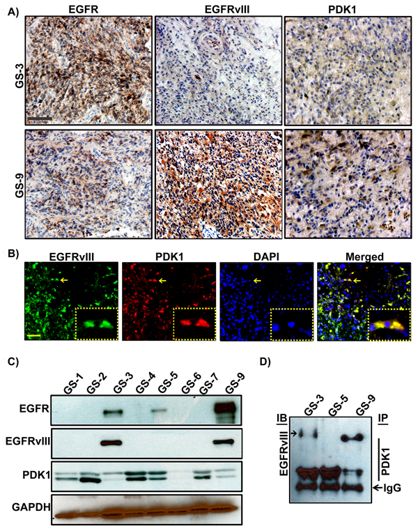 Figure 1: Detection of EGFR, EGFRvIII and PDK1 in hGBM clinical specimens. A. Immunohistochemical staining of a primary human GBM with EGFR-, EGFRvIII-, or PDK1-specific antibody (top) on consecutive sections is shown (brown, diaminobenzidine; light blue, nuclear counterstain with DAPI; Bar=100 µm) B. Dual immunohistochemical staining for co-localization was conducted with anti-EGFRvIII and anti-PDK1 antibodies followed by the secondary antibodies conjugated with fluorophores for red (PDK1), green (EGFRvIII) and blue (DAPI) fluorescence, respectively. Representative merged images show the cells expressing PDK1 and EGFRvIII. Bar=100 µm. C. Western blot analysis of EGFR, EGFRvIII and PDK1 protein expression in hGBM specimens D. Immunoprecipitation experiments were conducted on hGBM patient specimen tissue lysates by using PDK1 antibody. Western blotting analysis was performed on these immuno-precipitated samples using EGFRvIII antibody. IgG probing was done to confirm equal loading.
